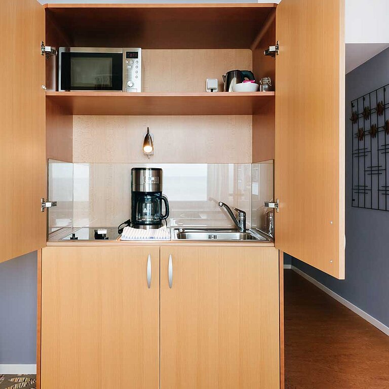 Als Gast in unseren "Klassik Appartements" können Sie sich mit einer gut ausgestatteten Pantry-Küche inkl. Herd, Mikrowelle, Kühlschrank sowie Kaffee-/Tee-Bereiter selbst versorgen.